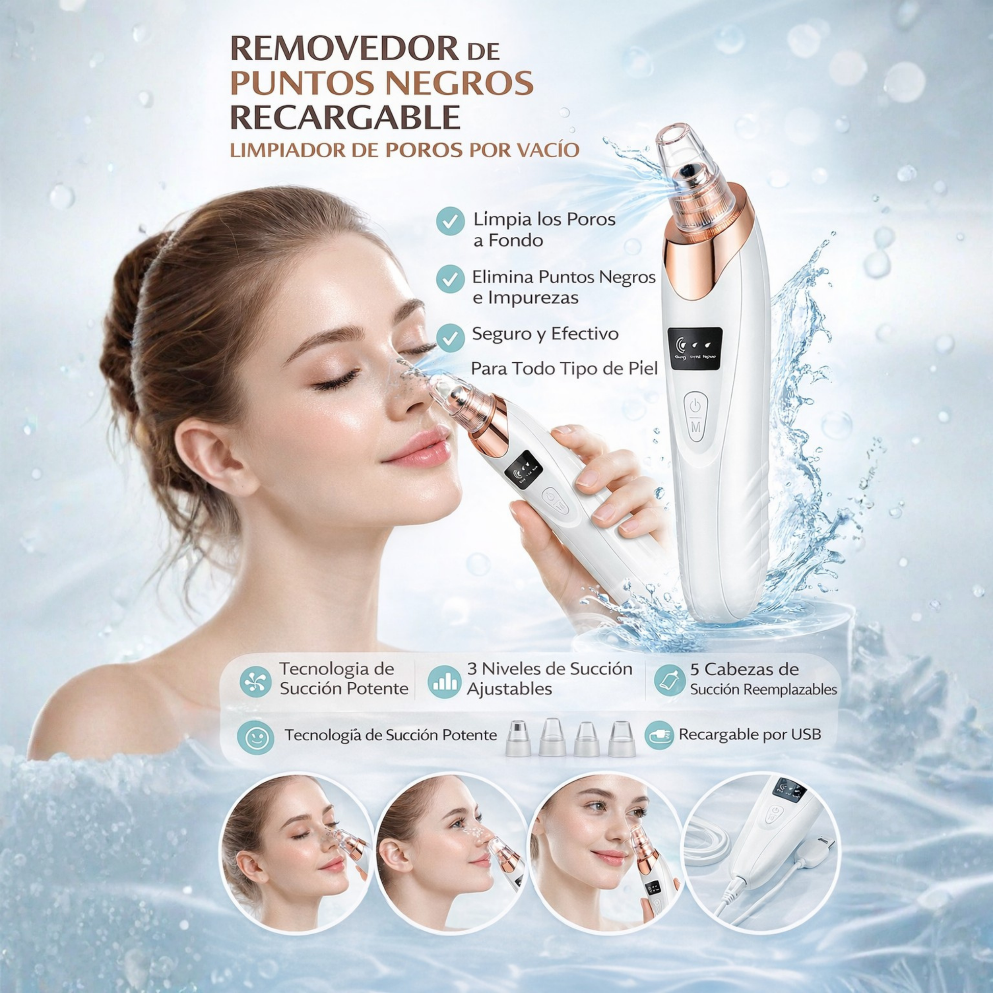 Sirve para eliminar puntos negros, puntos blancos, grasa acumulada, restos de maquillaje, acné leve y piel muerta mediante tecnología de succión al vacío, ayudando a limpiar profundamente los poros.